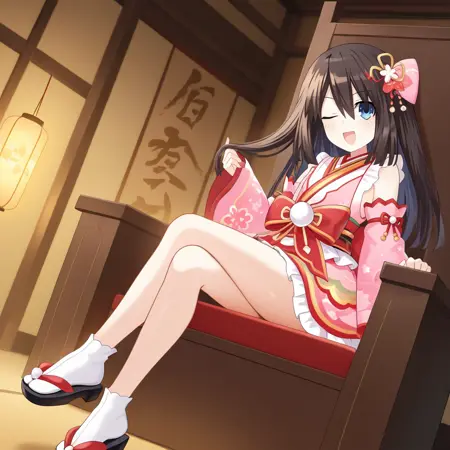 RamNep, Fol003, Rm_JP, 棕色头发, 长发, 蓝眼睛, 羊(neptunia), 无袖和服, 粉色和服, 分离式袖子, 粉色袖子, 花卉印花, 荷叶边和服, 荷叶边腰带, 红色腰带, 红色蝴蝶结, 腰部蝴蝶结, 荷叶边镶边, 宽袖, 袖子过腕, 红色丝带, 头饰, 白色足袋, 拖鞋,