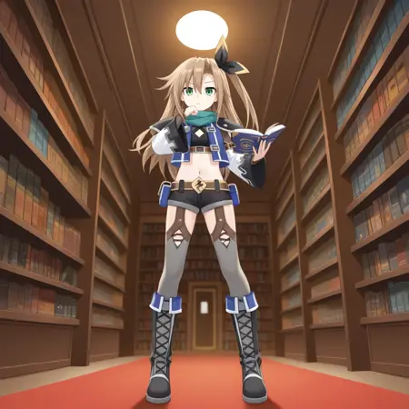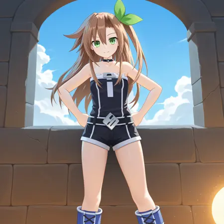 FNep, Fol003, Ifn_Adv, 갈색 머리카락, 한쪽을 위로 올린 스타일, 녹색 눈, 긴 머리, if (neptunia), 검은 리본, 검은 크롭탑, 허리, 배꼽, 머리 리본, 티올 스카프, 검은 반바지, 반바지, 갈색 벨트, 느슨한 벨트, 벨트 주머니, 파란 주머니, 크롭 재킷, 어깨 갑옷, 소매 슬릿, 소매 벨트, 대안 열린 재킷, 대안 파란 재킷, 층층이 겹친 소매, 다색 소매, 넓은 소매, 꿰매인 소매, 흰 소매, 검은 소매, 십자 끈 다리장식, 회색 허벅지 양말, 갈색 고리 끈, 검은 무릎 부츠,