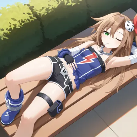 IFNep, Fol004, Ifn_Cas, 갈색 머리카락, 한쪽을 위로 올린 스타일, 녹색 눈, 긴 머리, 번개 무늬, if (neptunia), 프릴 장식 셔츠, 파란 어깨 드러난 셔츠, 허리 노출, 검은 반바지, 반바지, 검은 벨트, 느슨한 벨트, 허벅지 스트랩, 허벅지 주머니, 스파이크 장갑, 검은 장갑, 손가락 없는 장갑, 붕대 감은 팔, 체인 목걸이, 빨간 활, 두개골 머리장식, 스파이크 부츠, 지퍼 신발, 대안 파란 신발,
