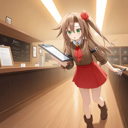 IFNep, Fol002, Ifn_Wtr, 갈색 머리카락, 한쪽을 위로 올린 스타일, 녹색 눈, 긴 머리, if (neptunia), 줄무늬 셔츠, 갈색 셔츠, 줄무늬 소매, 갈색 소매, 소매가 팔꿈치를 넘음, 소매 고리, 빨간 애스코트, 칼라가 있는 칼라, 흰 칼라, 빨간 치마, 치마, 빨간 리본, 빨간 장미, 빨간 꽃, 꽃 머리장식, 갈색 발목 부츠,