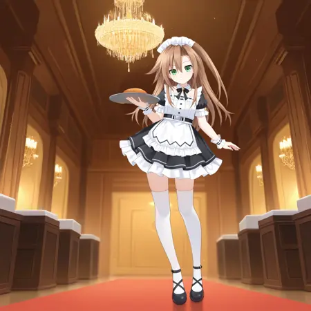 IFNep, Fol004, Ifn_Maid, 갈색 머리카락, 한쪽을 위로 올린 스타일, 녹색 눈, 긴 머리, if (neptunia), 엔메이드, 메이드 헤드기어, 프릴 장식 셔츠, 흰 셔츠, 분리형 칼라, 검은 리본, 목 리본, 프릴 장식 앞치마, 흰 앞치마, 검은 끈, 프릴 장식 소매, 볼륨감 있는 짧은 소매, 검은 소매, 프릴 장식 손목 장갑, 프릴 장식 치마, 검은 치마, 흰 치마, 흰 허벅지 양말, 검은 스트랩 신발,