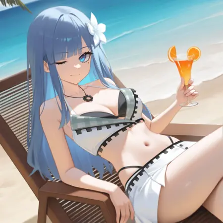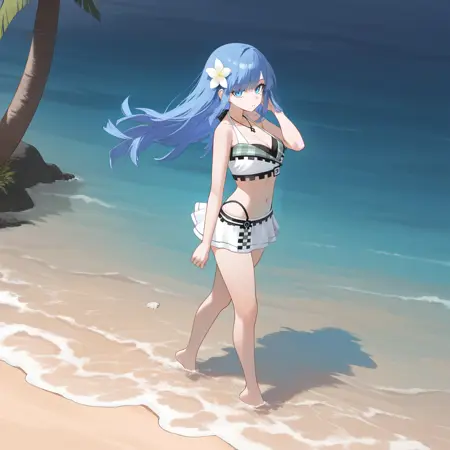 MagesNep, Mgs_Swm, 眼下有痣, 蓝色头发, 长发, 蓝色眼睛, 格子纹, 黑色比基尼, 白色吊带, 项链, 比基尼在衣物下, 白色短上衣, 露腹, 肚脐, 迷你裙, 白色裙子, 白色内裤带, 齿轮, 齿状图案, 头发花饰, 白色花朵,