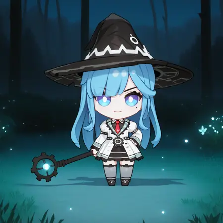 MagesNep, Mgs_Def, 蓝色头发, 长发, 蓝色眼睛, 眼下有痣, 女巫帽, 黑色头饰, 齿轮, 齿状图案, 格子纹, 白色外套, 有领外套, 朱丽叶袖, 袖带, 白色袖子, 褶边裙, 黑色裙子, 有领衬衫, 黑色衬衫, 白色衣领, 红色领结, 灰色过膝袜, 交叉系带鞋, 黑色短靴,