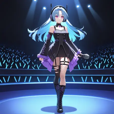 5pbNep, Pb_Idl, 눈 밑 주근깨, 파란 머리, 긴 머리, 분홍 눈, 피시넷 허벅지 양말, 검정 허벅지 양말, 찢어진 허벅지 양말, 어울리지 않는 허벅지 양말, 비대칭 하의, 스트랩 드레스, 검정 드레스, 계층적 드레스, 미니스커트, 검정 스커트, 쇼걸 스커트, 분리된 소매, 검정 소매, 십자 끈 소매, 주름 장식 소매, 손목보다 긴 소매, 접힌 스커트, 십자 끈 신발, 검정 무릎 부츠, 보라색 트리밍, 헤드폰, 분리된 칼라, 검정 칼라, 어깨 노출,
