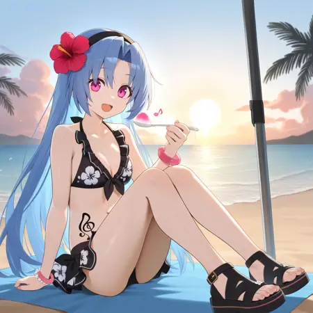 5pbNep, Pb_Swm, 눈 밑 주근깨, 파란 머리, 긴 머리, 분홍 눈, 음표 문신, 문신, 복부 문신, 머리 꽃, 헤어밴드, 주름 장식 비키니, 검정 비키니, 히비스커스, 플로럴 프린트, 비키니 스커트, 리본 트리밍 비키니, 여러 개의 팔찌, 구슬 팔찌, 분홍 팔찌, 홀터넥,