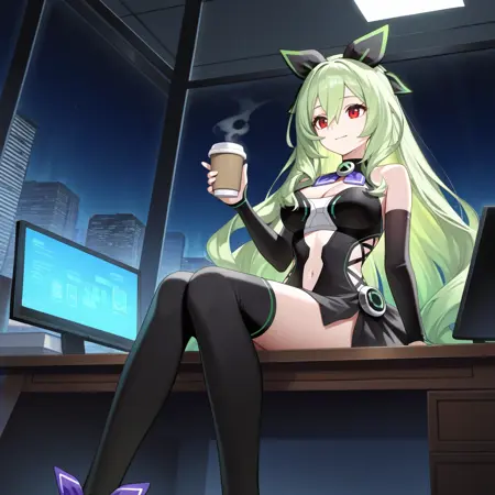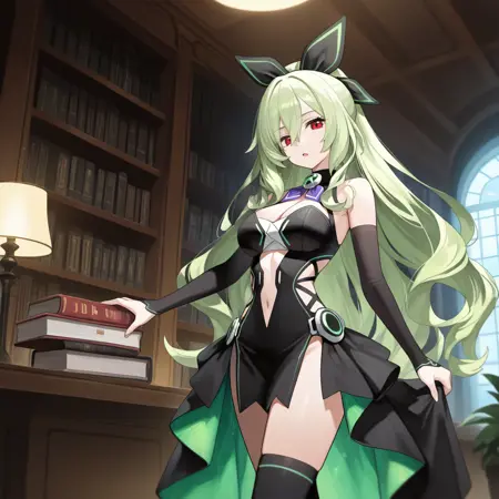 ChikaNep, ヘアリボン, 緑色の髪, 赤い目, 非常に長い髪, 外側の袖, 胸元の露出, 黒い袖, 長袖, 短いペルティカーテン, 黒いドレス, おへそ, 袖なしドレス, ハンター neckline, サイドカットアウト, 交差リボン装飾, 中央のカットアウト, 胸元のカットアウト, 開いたスカート, 黒いスカート, 緑のアンダースカート, 紫のリボン, 首リボン, 黒いリボン, 緑のトリム, 肩の露出, 太ももブーツ, 黒い靴, 靴のリボン,