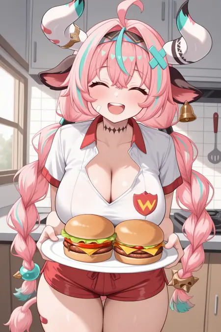 | 训练词汇 | v4r3s4, large breasts, cow girl, cow horns, mismatched horns, multicolored horns, bandaid on horn, cow tail, pink tail, cow ears, purple eyes, two-tone hair, pink hair, aqua hair, streaked hair, ahoge, hair intakes, hair between eyes, crossed bangs, twintails, twin braids, x hair ornament, long hair, horn ornament, ear bell, neck tattoo, multicolored hairband, bandaid on cheek已复制! multiple rings, two-tone bowtie, aqua bowtie, pink bowtie, fur-trimmed sweater, yellow sweater, tied sweater, cropped sweater, clothing cutout, black tank top, detached sleeves, long sleeves, yellow sleeves, arm ribbon, pink belt, black skirt, pleated skirt, miniskirt, bandaid on thigh, asymmetrical legwear, single thighhigh, white thighhighs, pink knee brace, white leg warmers已复制! |