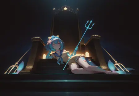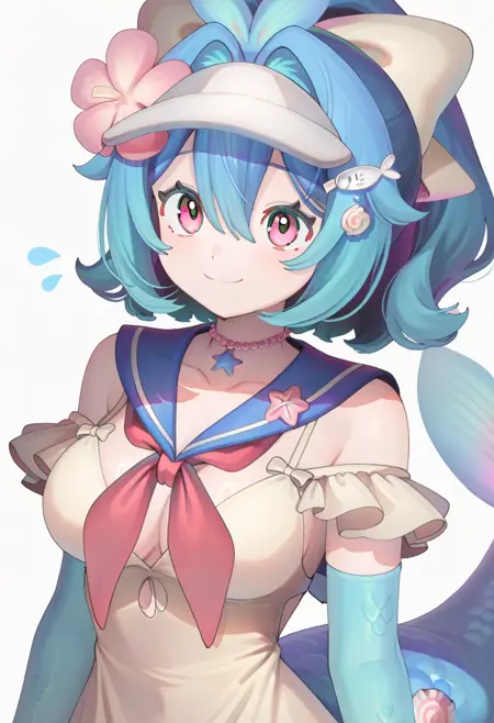 lazuli, 1girl, blue hair, hair bow, yellow bow, pink eyes, short hair, wide ponytail, medium breasts, fish tail, blue scales, head fins, visor cap, fish hair ornament, hair flower, pearl choker, sailor dress, yellow dress, single off shoulder, neckerchief, blue arms, blue hands