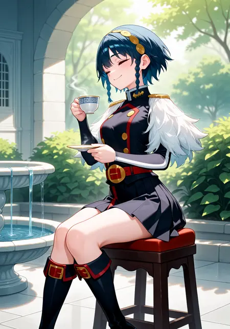 - 黒いユニフォーム、白い毛皮の肩当て、黒い非対称スカート、赤いベルト、黒い膝丈ブーツ