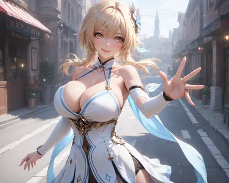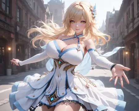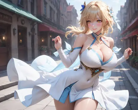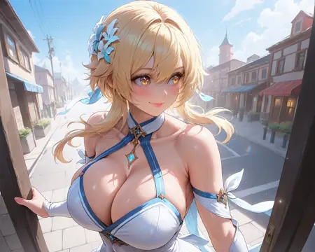 블론드 헤어, 흰색 드레스, 단발, 머리꽃, 머리장식, 노란 눈, 어깨 노출, 분리된 소매