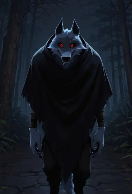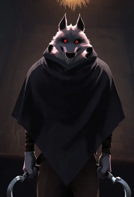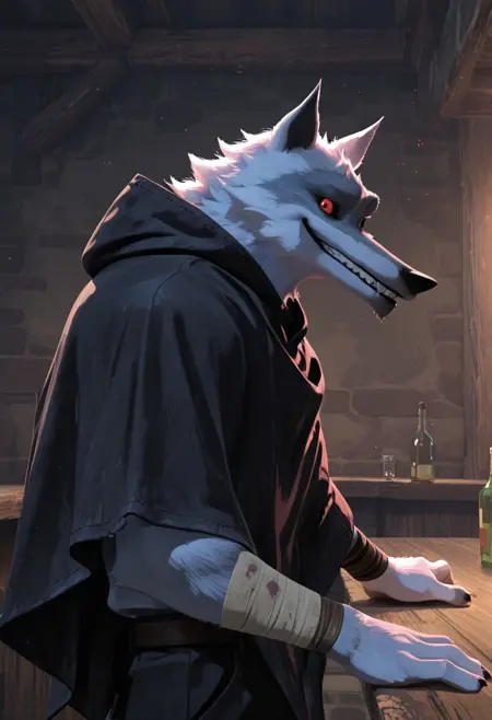 DeathWolf, 1boy, mature male, male, athletic build, anthro, wolf, white fur, animal ears, red eyes, black sclera