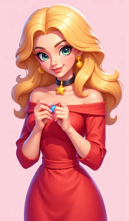 優雅な気質を持つプリンセスが、豪華なプリンセスドレスを着て、とても軽やかで優雅に現れる。髪は金色で、長い編み込み髪の先には青いリボンがついている。頭には繊細な王冠をかぶっている。ドレスは黄色で、白い袖と白いウエストバンドがあり、複数のレースの層で装飾されており、全体的に簡素で優雅な印象を与える。背景は青色のグラデーションで、黄色い衣装とは鮮やかなコントラストを形成している。全体の構図はバランスが取れており、調和のとれた色使いで、静かで美しい感覚を人々に与える。