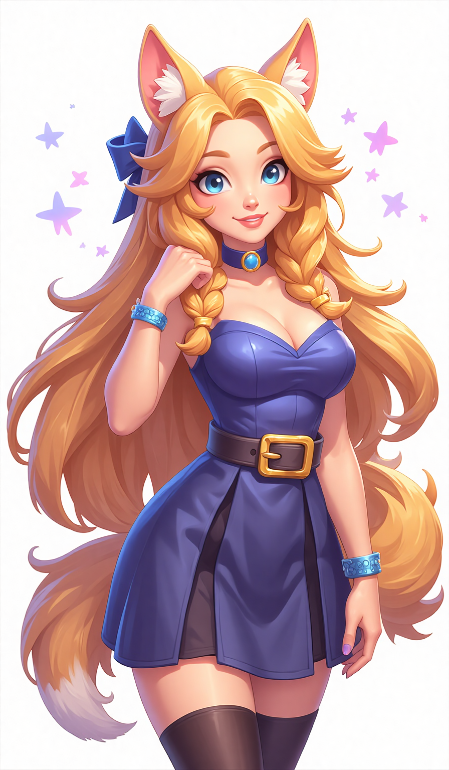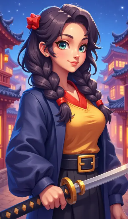 A princess with an elegant temperament,dressed in a gorgeous princess dress,appears very light and graceful. Her hair is golden,with long braids and a blue bow at the end. She wears a delicate crown on her head. Her dress is yellow with white sleeves and a white waistband,adorned with multiple layers of lace,giving it a simple and elegant overall look. The background is a blue gradient,forming a sharp contrast with the yellow clothes. The overall composition is balanced,with harmonious colors,giving people a quiet and beautiful feeling