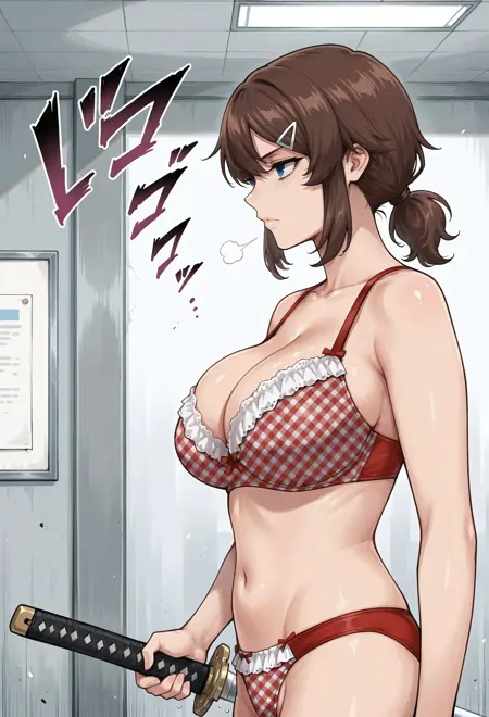 l1n0nly, 1girl, brown hair, short hair, ponytail, blue eyes, empty eyes, collarbone, large breasts, navel, midriff, groin, hair ornament, hairclip, underwear, red bra, plaid bra, frilled bra, red panties, plaid panties, frilled panties