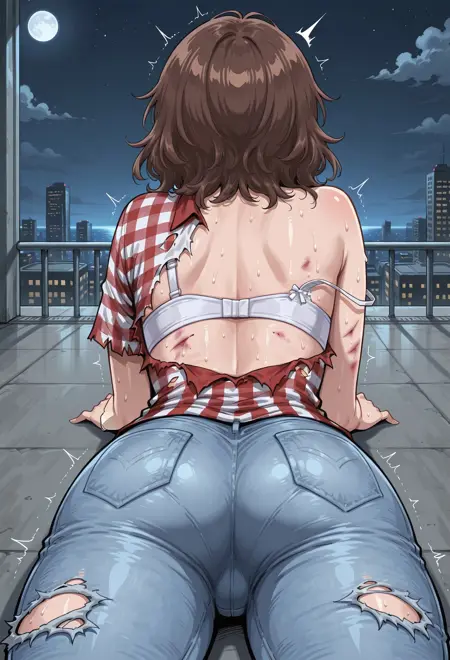 Torn shirt: white bra, underwear, hairclip, pants, , plaid shirt, jeans, torn shirt
