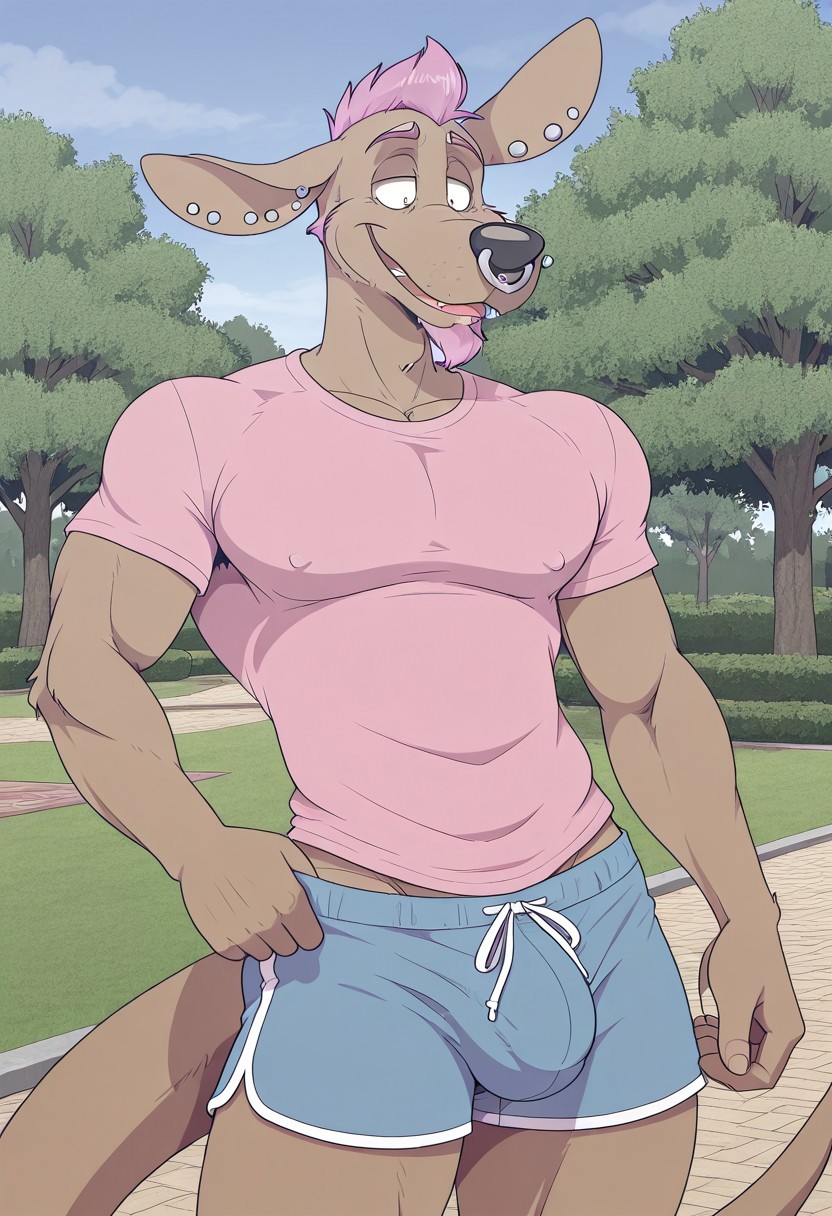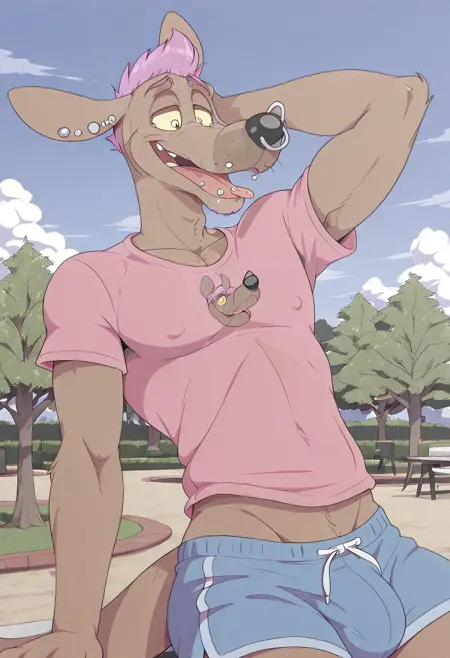 yellow whites of the eyes, kangaroo tail, pink beard, nipple piercing, hairy armpits, anti_dev style, muscles, piercing, pink hair, gray, penis piercing, tongue piercing, ear piercing, male, nose piercing