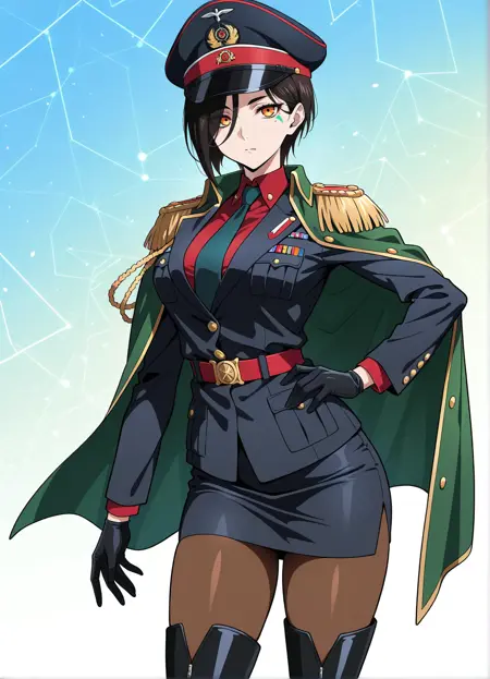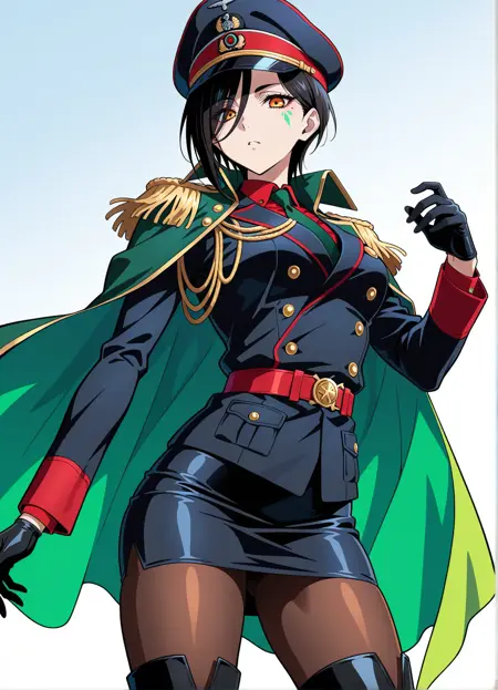 outfit2, military_outfit, skirt, thighhighs, gloves, long sleeves, hat, jacket, pantyhose, boots, necktie, black gloves, belt, miniskirt, black skirt, cape, black footwear, black jacket, dark brown jacket, black headwear, thigh boots, peaked cap, pencil skirt, epaulettes, brown pantyhose, military hat, green cape, thighhighs over pantyhose, red shirt, thin belt, wide jacket,