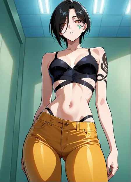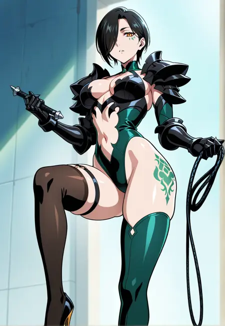 left thigh facial mark, octahedron facial mark, outfit1, black gauntlets, bare shoulders, black pauldrons, highleg leotard, green leotard, cleavage, black right thighhigh, dark green left thighhigh, cutout right thighhigh, snake paint leotard, spikes whip, whip, weapon,