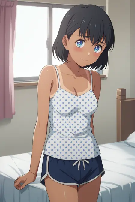 outfit_3, camisole, polka dot, bare shoulders, dark blue shorts, dolphin shorts, short shorts,