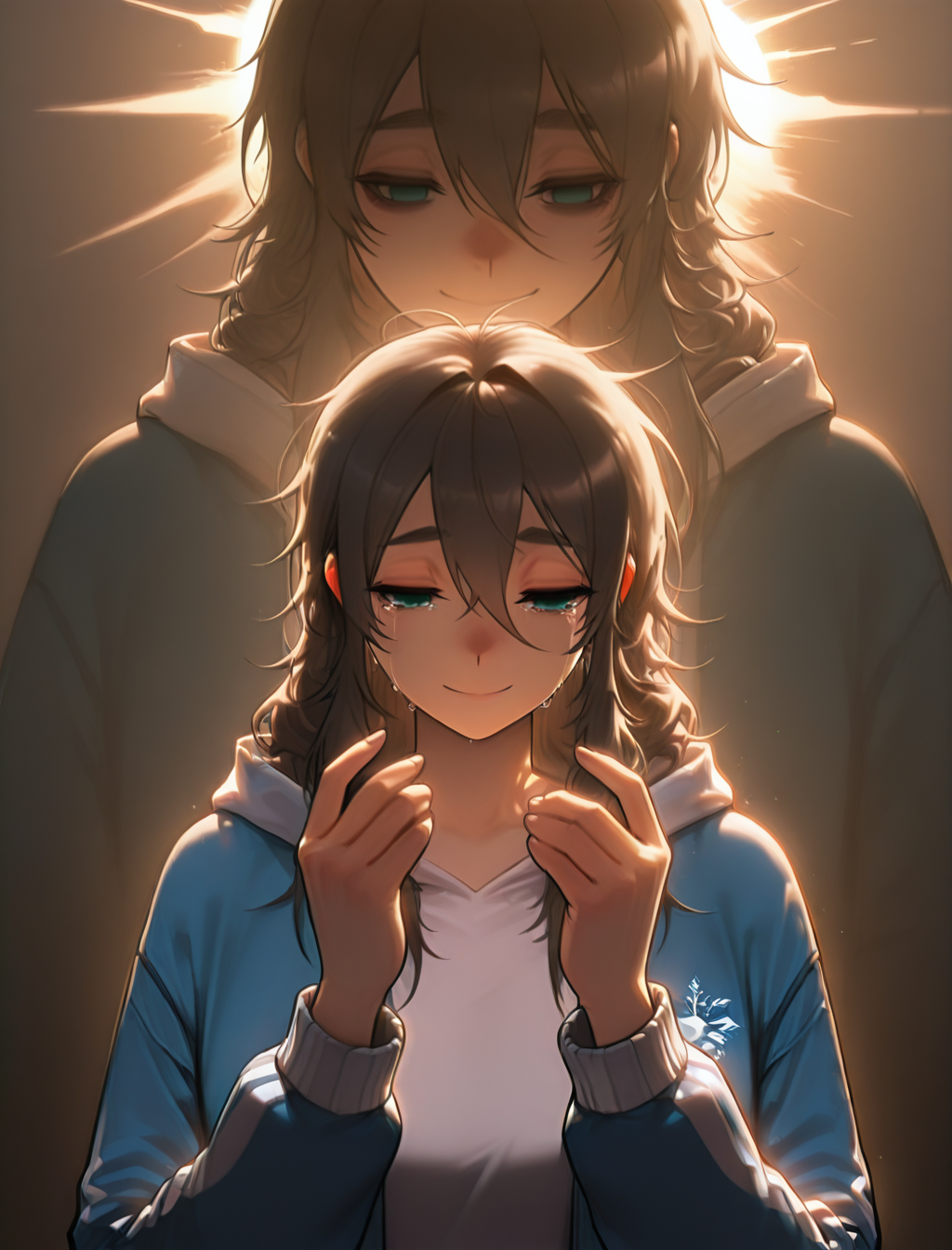 blue jacket, white shirt, black pants