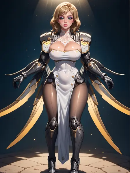 プロンプト:1girl, (SerenaFD), solo, ブロンドヘア, 緑の目, 白いドレス, 脐カバー, ペルビックカーテン, パンティーホース, 高めの襟, アーマー装備, 機械式の手甲, 肩のアーマー, 機械式のブーツ, ハイヒール, 翼, 機械翼, 下背部に金属製の翼、鋭い切れ込みあり、
