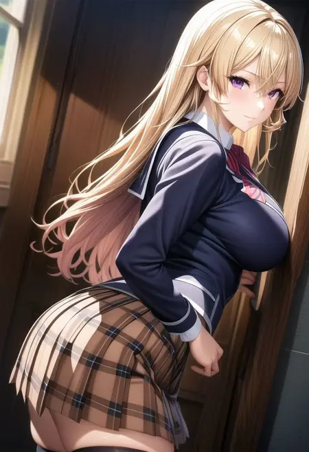 Trigger words: erina_a_xl, blonde hair, long hair, hair between eyes, purple eyes, large breasts, red ribbon tie, school uniform, tootsuki school uniform, skirt, plaid skirt, thighhighs, black thighhighs,
