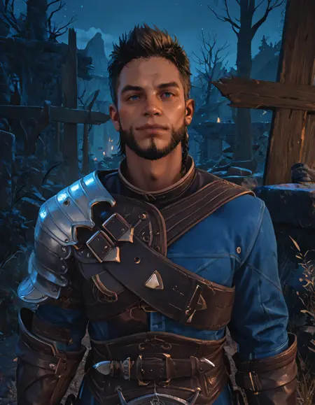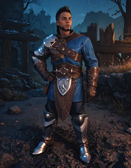 single pauldron, leather tunic, leather gauntlets, chest belt, leather belt, leather pants, armored knee boots