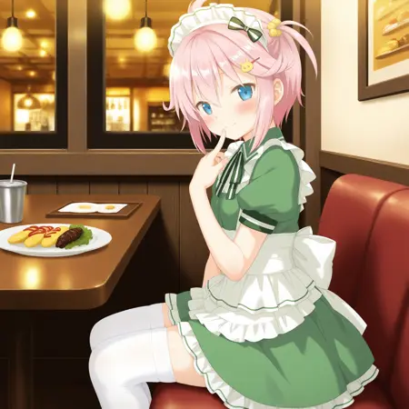 maid,maid headdress,white thighhighs,hair ornament,short sleeves,green dress,puffy sleeves,apron,frills,puffy short sleeves,