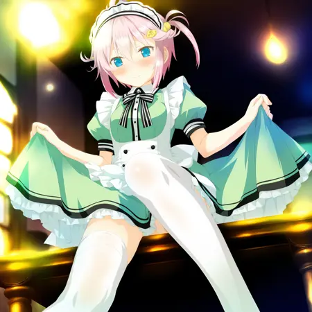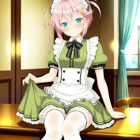 maid,maid headdress,white thighhighs,hair ornament,short sleeves,green dress,puffy sleeves,apron,frills,puffy short sleeves,