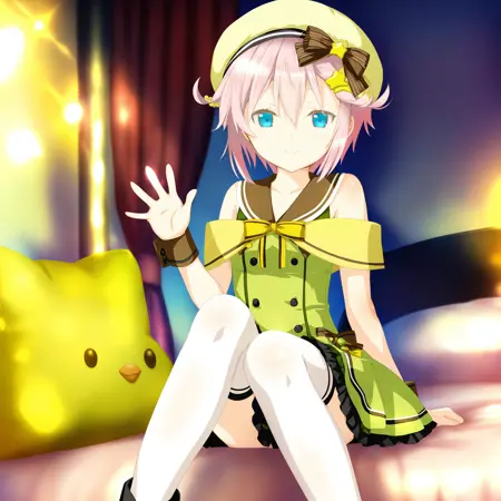白いタイツ、緑のドレス、茶色いリボン、手首の cuffs、帽子、ベレー帽、髪飾り、黄色いリボン、ノースリーブ、フリル、肩出し、星(シンボル)、茶色いヘアウェア、黄色いヘアウェア、フリル付きドレス、オフショルダー、ノースリーブドレス、プリーツドレス、