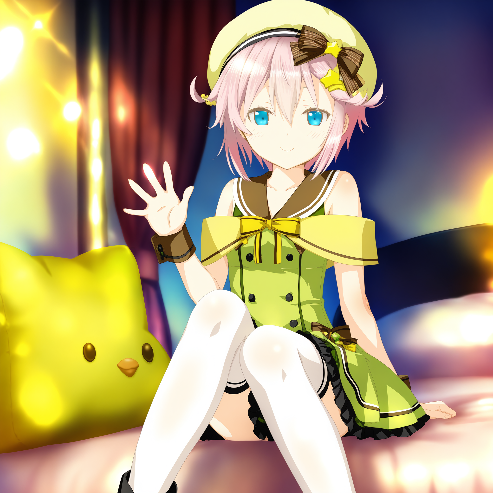 white thighhighs,green dress,brown bow,wrist cuffs,hat,beret,hair ornament,yellow bow,sleeveless,frills,bare shoulders,star \(symbol\),brown headwear,yellow headwear,frilled dress,off shoulder,sleeveless dress,pleated dress,
