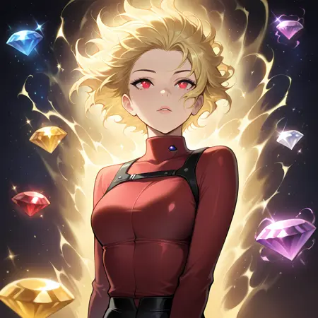 aura, blonde hair, gold hair, raised hair, floating hair, red eyes, gold aura, electricity, gems, floating gems