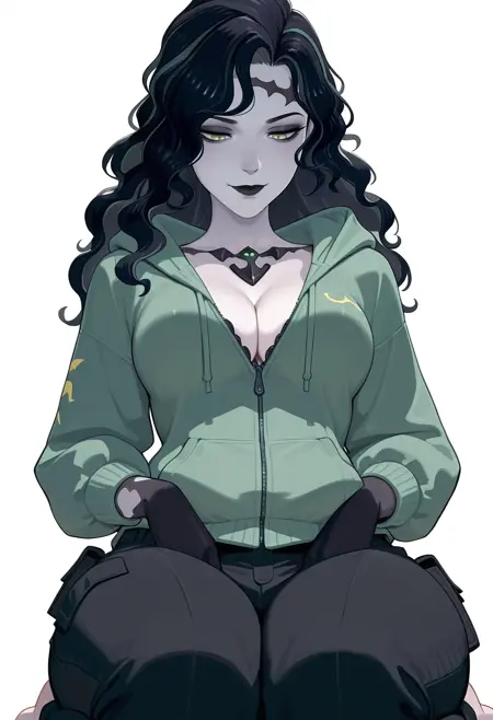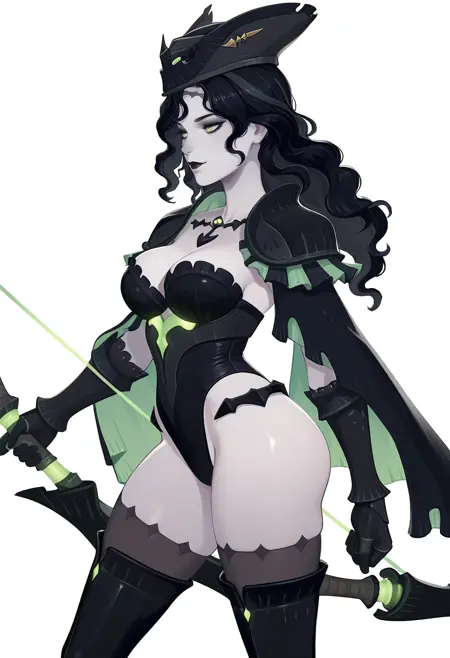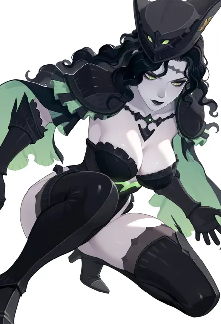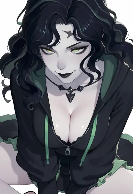 Bonnie/cnn, 1girl, black hair, black lips, long hair, green eyes, cleavage, colored skin, makeup,pale skin,