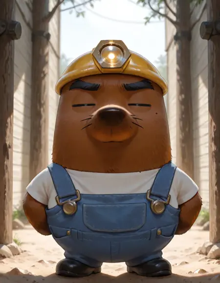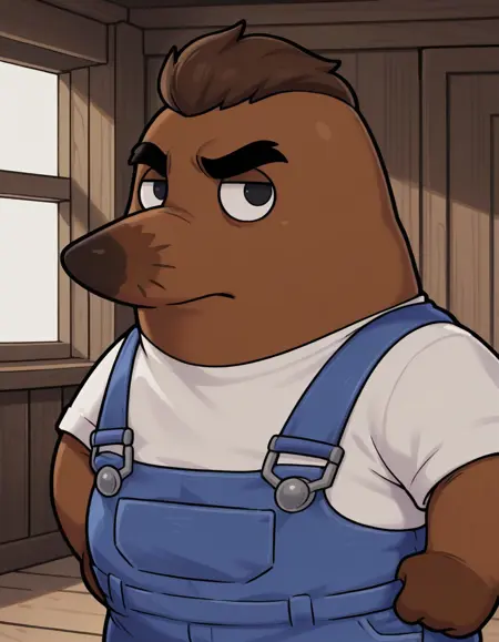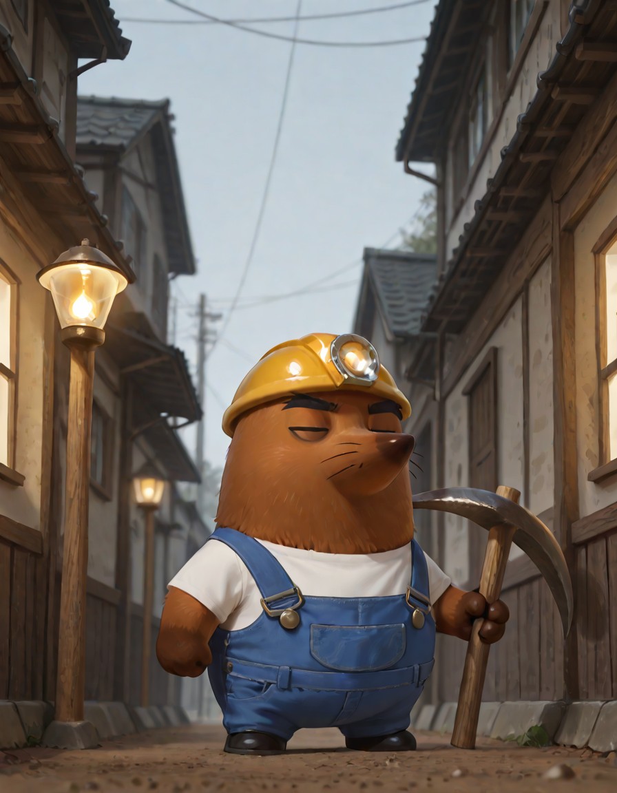 Resetti-AC, 두더지, 짙은 갈색 끝이 있는 갈색 털, 길고 뾰족한 코, 수염, 큰 검은 눈썹, 검은 눈, 닫힌 눈, 갈색 머리카락, 흰 티셔츠, 파란 청바지 작업복, 등불이 달린 노란색 광부 헬멧, 곡괭이