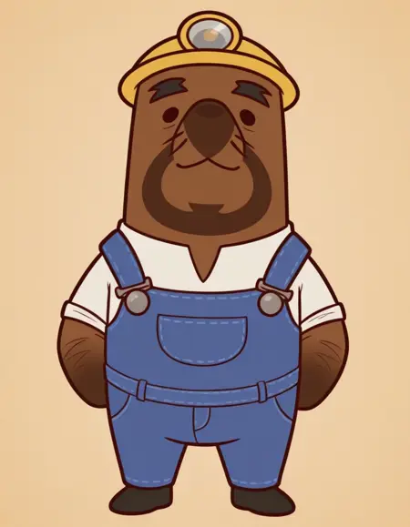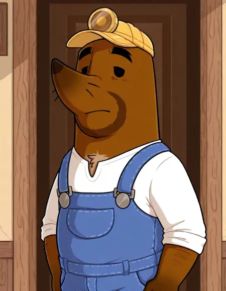 DonR-AC, 土拨鼠, 棕色皮毛带深棕色尖端,长而尖的吻部,触须,浓黑的眉毛,黑色眼睛,棕色山羊胡,面部毛发,黑色头发,高大,白色衬衫,蓝色牛仔背带裤,戴灯的黄色矿工帽,十字镐
