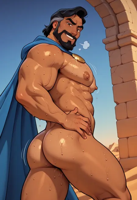 Dark skin, Blue cape, gold badge, Gold cock ring,