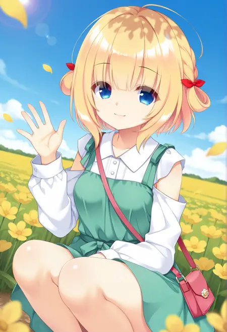 hair ornament,shoulder cutout,white shirt,collar,puffy long sleeves,sleeves past wrists,clothing cutout,green dress,puffy sleeves,detached sleeves,shoulder bag,pink bag,