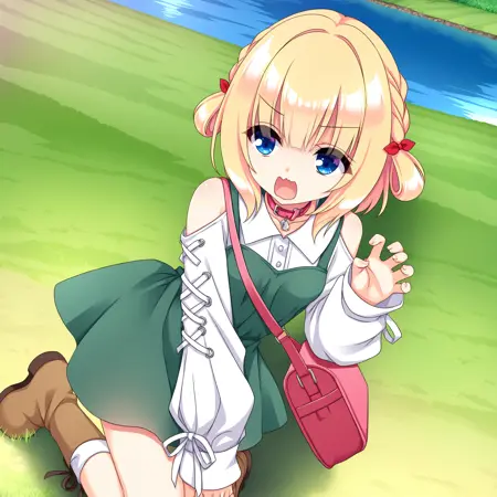hair ornament,shoulder cutout,white shirt,collar,puffy long sleeves,sleeves past wrists,clothing cutout,green dress,puffy sleeves,detached sleeves,shoulder bag,pink bag,