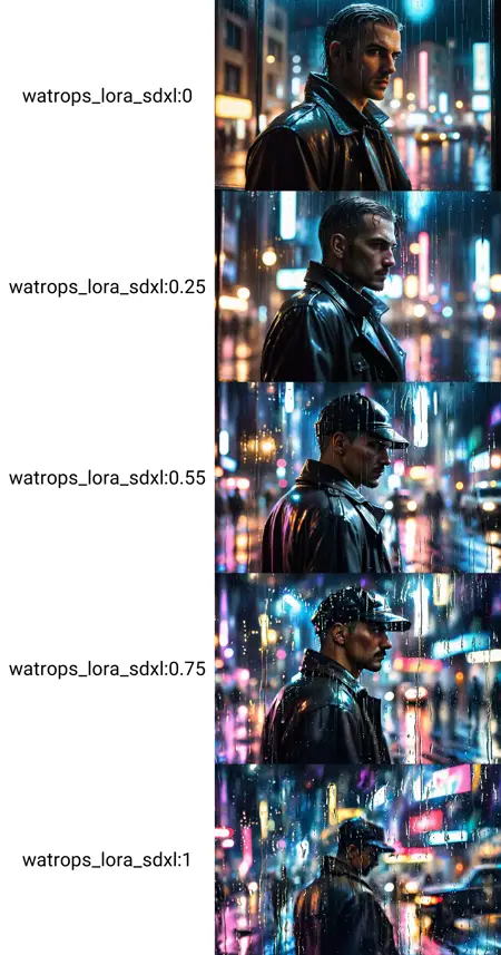 이 LoRA는 창문 유리에 물방울이 맺히는 것을 표현하기 위해 훈련되었습니다. 창문 유리 뒤에 보이는 장면은 심도 효과로 흐릿하게 처리됩니다.