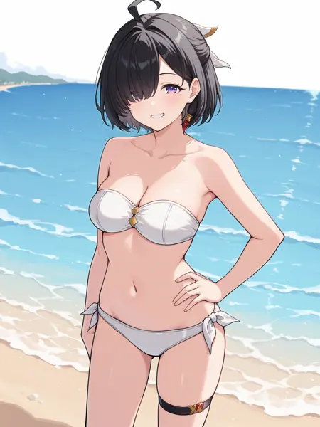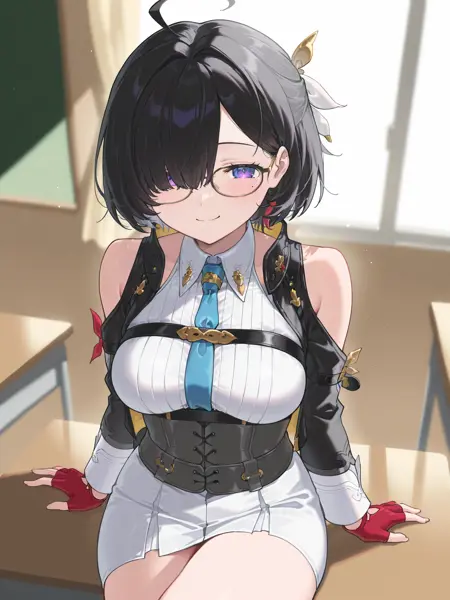 外观:ilyumia,短发,黑发,头发遮住一只眼睛,紫色眼睛,眼下有痣,中等胸部,发饰