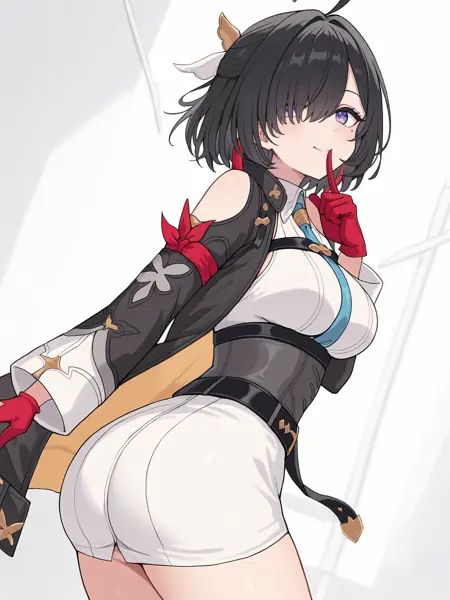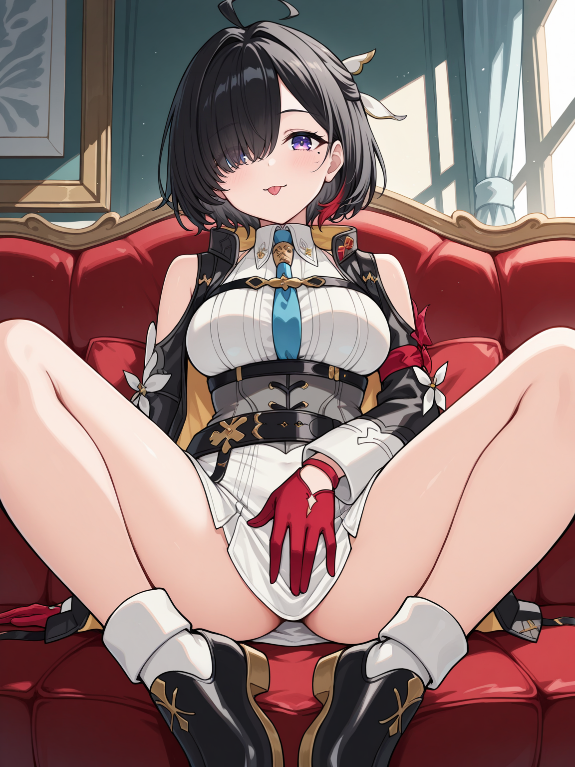 服装:白色连衣裙,短裙,无袖裙,灰色紧身胸衣,黑色夹克,露肩设计,长袖,黑色腰带,腰部腰带,胸部腰带,蓝色领结,红色手套,赤裸双腿