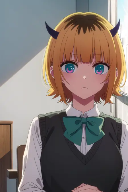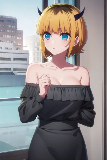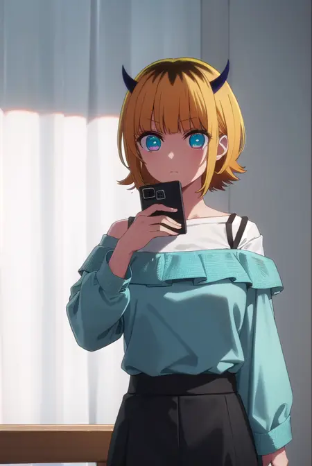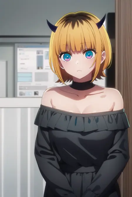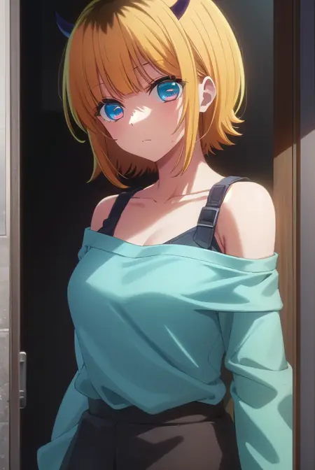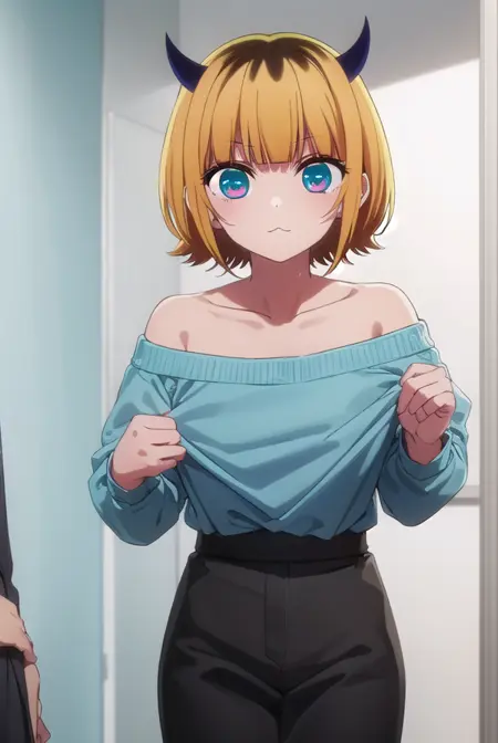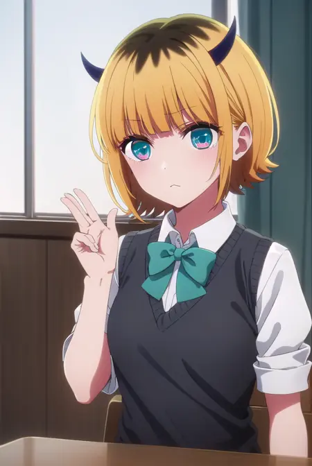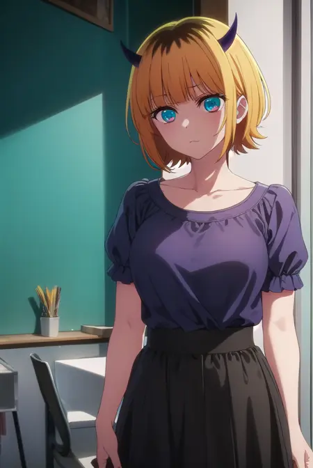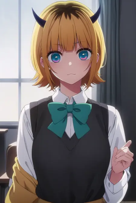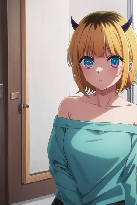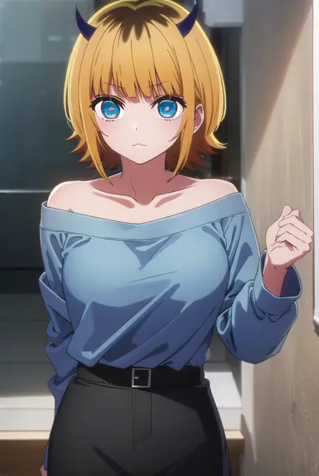 memcho, blonde hair, blue eyes, blunt bangs, demon horns, fake horns, horns, short hair,