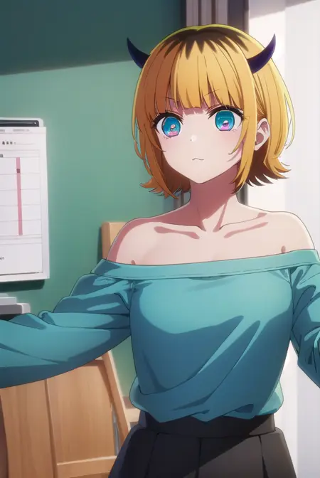 bare shoulders, black skirt, (blue sweater:1.5), long sleeves, off shoulder, off-shoulder sweater, puffy sleeves, skirt, sweater, white ribbon,