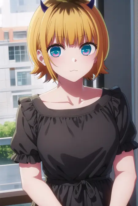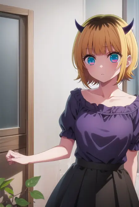 memcho, ブロンドの髪, 青い目, まっすぐな前髪, 悪魔の角, 偽の角, 角, 短い髪,