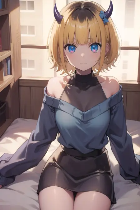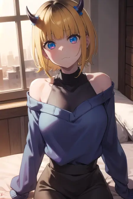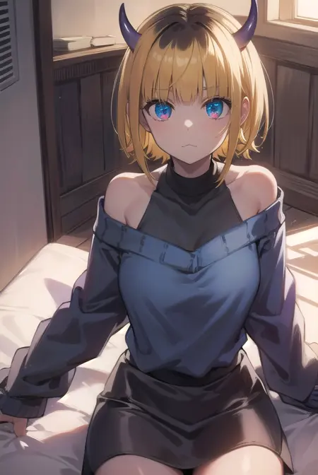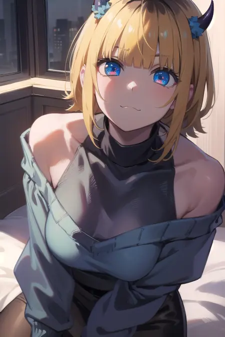 memcho, blonde hair, blue eyes, blunt bangs, demon horns, fake horns, horns, short hair,