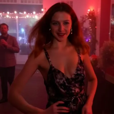 밝은 색의 플레이수트, 보라색과 검은색 뱀무늬 패턴, 깊게 파인 V넥