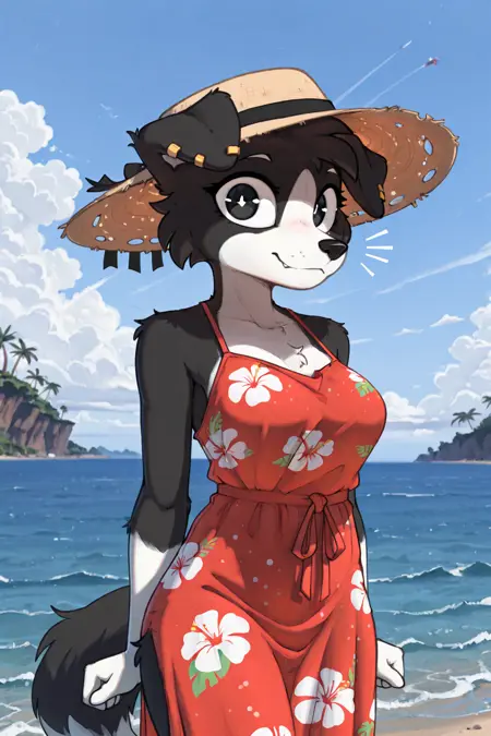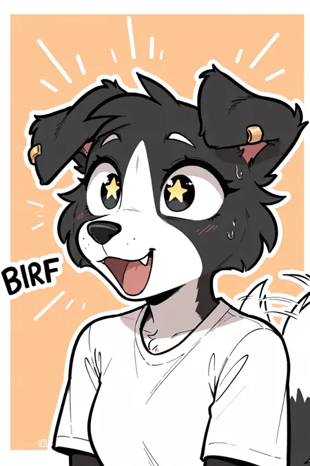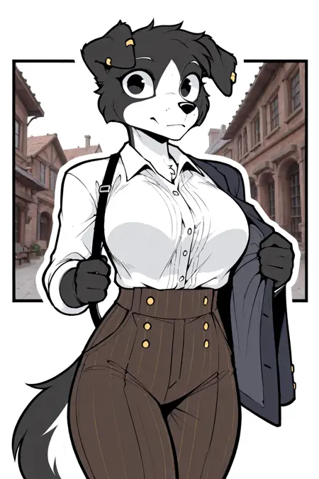 트리거: 여성, 반인간, 보더콜리, 개과, 검은 털, 흰 털, 검은 눈, 귀 피어싱, 얼굴 털주름, 늘어진 귀