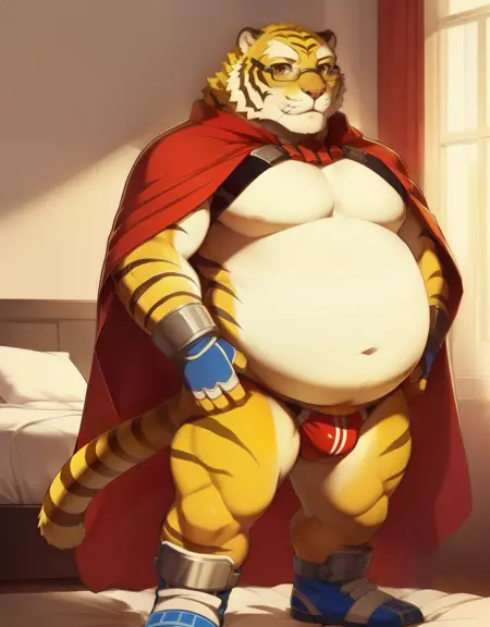 関連単語:tiger stripes、white fur、yellow fur、black fur、multicolored fur、body fur、blonde hair、short hair、male pubic hair、facial hair、beard、blue eyes、thick eyebrows、tiger tail、tiger boy、tiger ears、animal ears、animal nose、snout、old man、glasses、white coat、open coat、open clothes、sleeves rolled up、hands in pockets、slippers、flip-flops