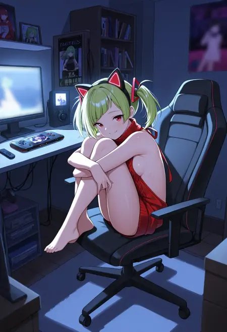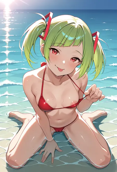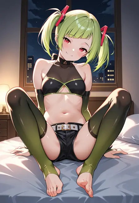 DelutayaCute, 녹색 머리카락, 빨간 눈, 대각선 앞머리, 작은 가슴, 단발, 짧은 트윈테일, 삼각형 머리 장식