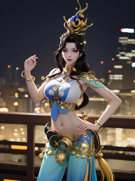 - WZRYdiaochanYJHX,1girl,solo,jewelry,bell,bracelet,black hair,pants,navel,long hair,hair ornament,midriff,looking at viewer,blue eyes,cityscape,night,mature female,cowboy shot,hand on hip,jewelry,